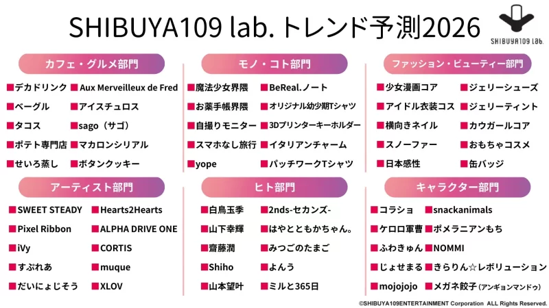 株式会社SHIBUYA109エンタテイメントが運営する若者マーケティング研究機関「SHIBUYA109 lab.」は、独自ネットワーク「SHIBUYA109 lab. MATE」に所属するaround20(15~24歳)の女性401名を対象に実施した2026年のトレンド予測の結果を発表しました。今年の予測では、新たにキャラクター部門が新設され、全6部門で多角的なトレンドが紹介されています。