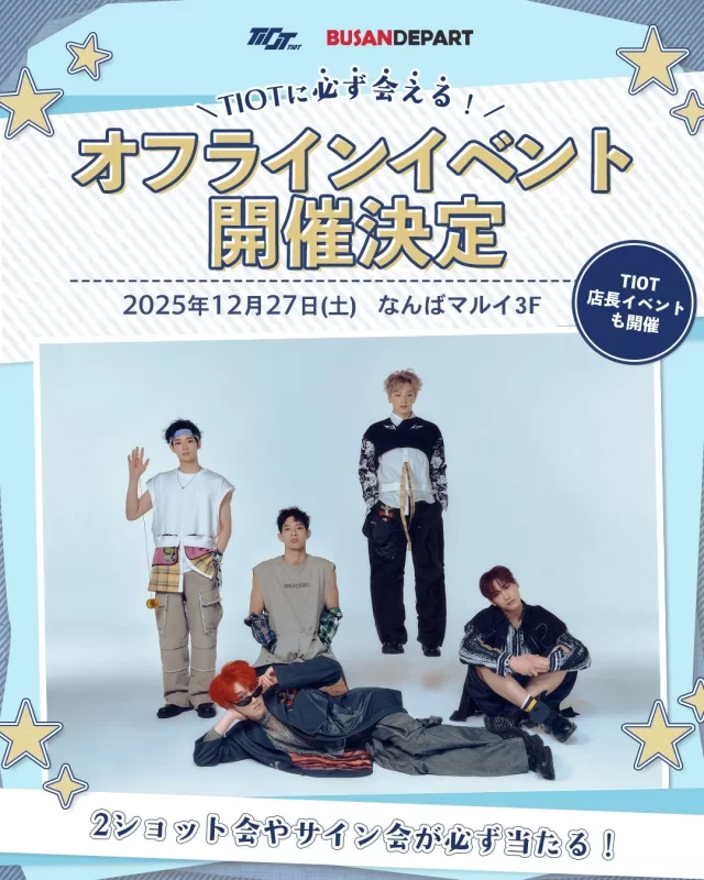 韓国の5人組ボーイズグループTIOTが、大阪・なんばマルイのBUSAN DEPARTにてスペシャルオフラインイベントを開催します。人生4カット撮影会、サイン会、2ショット会、ハイタッチ会など、ファンにはたまらない豪華企画が盛りだくさんです!
