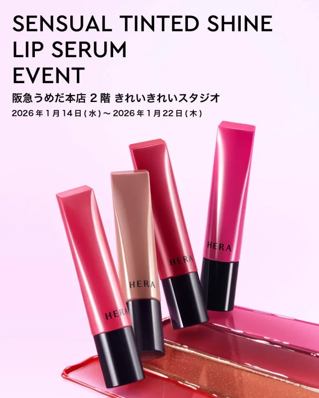 韓国・ソウル発のラグジュアリーメイクアップブランド「HERA(ヘラ)」が、阪急うめだ本店2階きれいきれいスタジオにて、新商品「センシュアル ティンティッドシャイン リップセラム」のイベントを開催します。期間は2026年1月14日(水)から1月22日(木)までです。