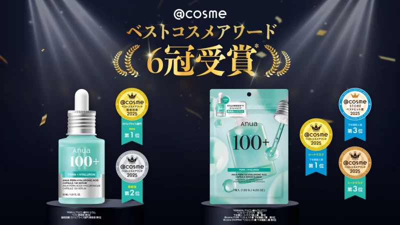グローバルスキンケアブランド「Anua(アヌア)」の「PDRNライン」が、「@cosmeベストコスメアワード2025」において、合計6冠を受賞したことが発表されました!