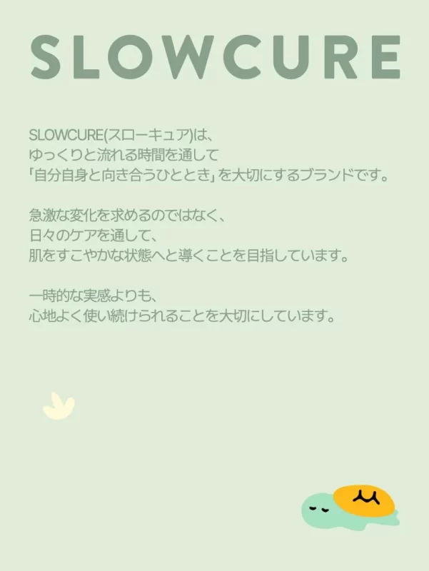 「SLOWCURE(スローキュア)」は、株式会社フェイスラナーが展開するライフスタイルケアブランドです。このブランドは、「急激な変化を求めるのではなく、自分自身と向き合い日々のケアを大切にする」という哲学を掲げています。刺激を受けやすい肌状態に配慮したやさしい処方で、日常生活の中で無理なく継続できるケア方法を提案しているのが特徴です。