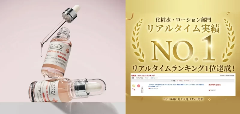 COOPYの主力商品「PDRNアンプル」は、2026年1月19日13:20時点の楽天市場「化粧水・ローション部門」リアルタイムランキングで1位を獲得しています。この人気を受けて、より多くの人がCOOPYの全ラインナップを気軽に購入できるよう、公式オンラインストアが開設されました。